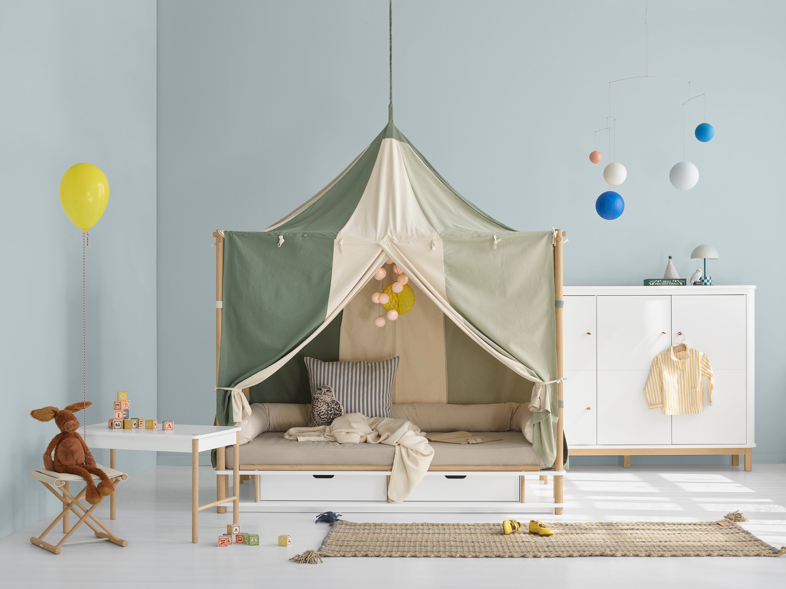 CAMP BED CANOPY CIRCUS is created from bold, undyed canvas with delicate stripes in green, enclosing the bed on all sides, while the roof, with the help of a hook in the ceiling, gives the canopy a distinctive circus look. When the canopy is rolled up on the sides or pushed aside and tied to the bed frame, it becomes like a circus ring, where grand performances can take place. Here are tall hats and whiskered rabbits, magic dust and trapezes soaring away under thousands of sparkling stars, ready to be plucked from the dark blue arch of the sky. When the canopy is lowered, it magically protects like an invisibility cloak against what others call duties and everyday life, which feels miles away when the train is running at full steam towards irresistible enchantment. Homework, both one's own and friends', is done by the wise owl, riding on the bedpost at full gallop, and at night whispers the canopy full of delightful, whimsical secrets that one can only partially remember when the morning light slowly seeps in through the narrow cracks of the canopy, and it all feels like - a dream.