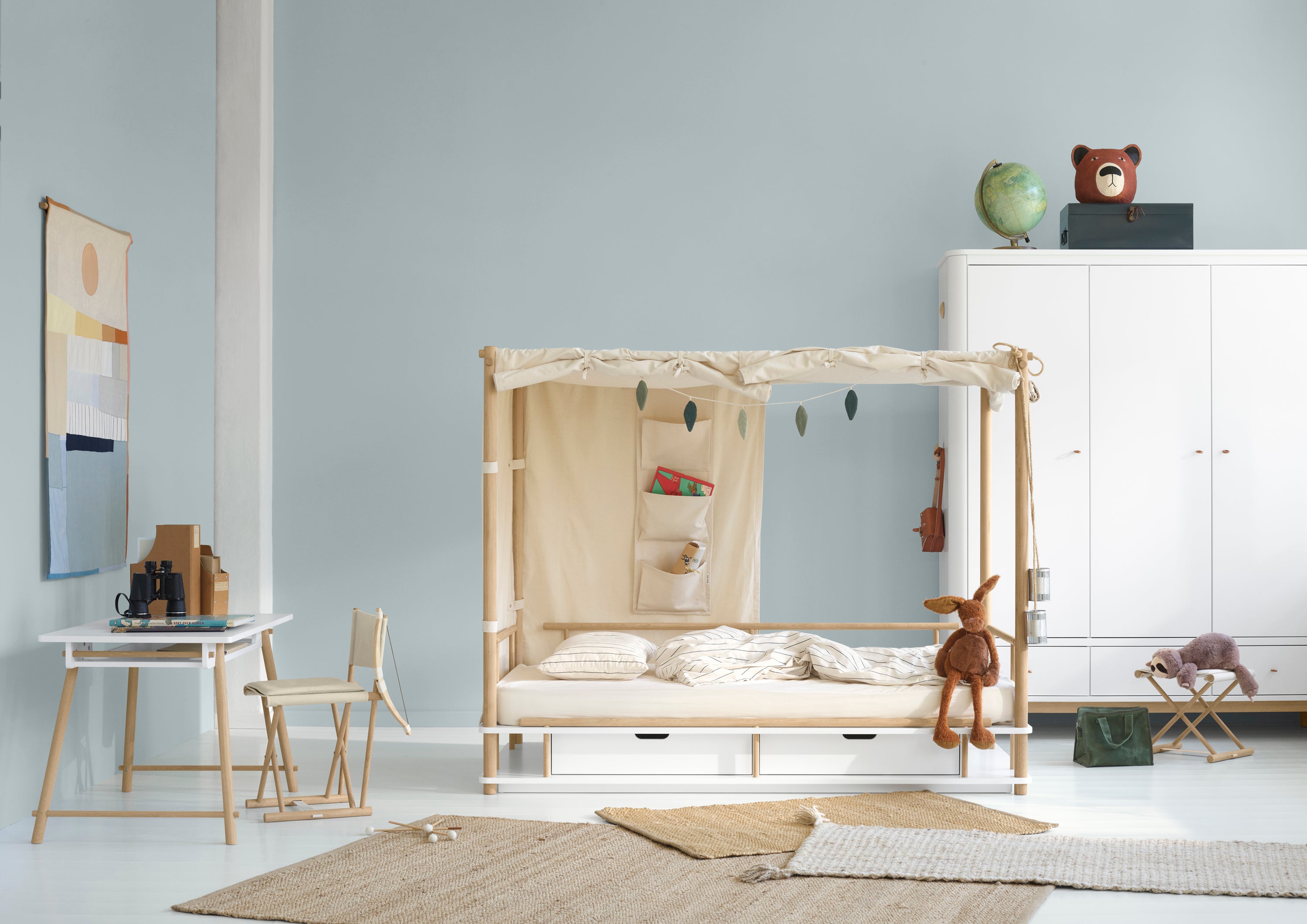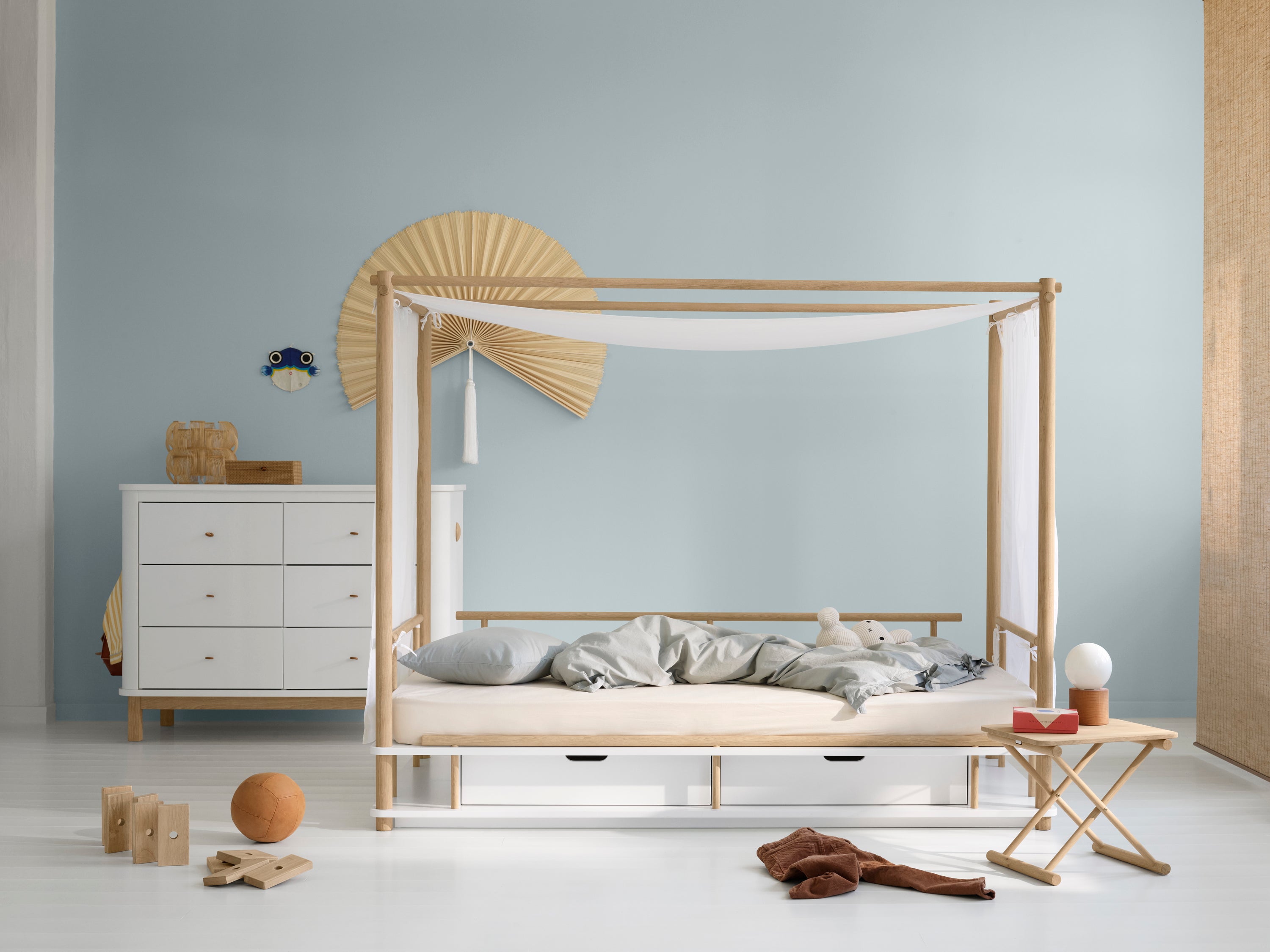 Central to the Camp Collection is the Camp canopy bed, which in its basic form is a day bed with what resembles a classic frame for a canopy, inviting all kinds of expressions, scenarios, and universes to unfold. The bed with the frame, beautifully crafted in oak with hidden screws and practical drawers underneath, can stand alone, but the construction truly shines with one of the four canopies created for the bed. The four canopies, which can be purchased separately, are designed to cater to unique personalities. The bed with a canopy creates both a safe haven for the night and a platform for daydreaming and playing during the day.