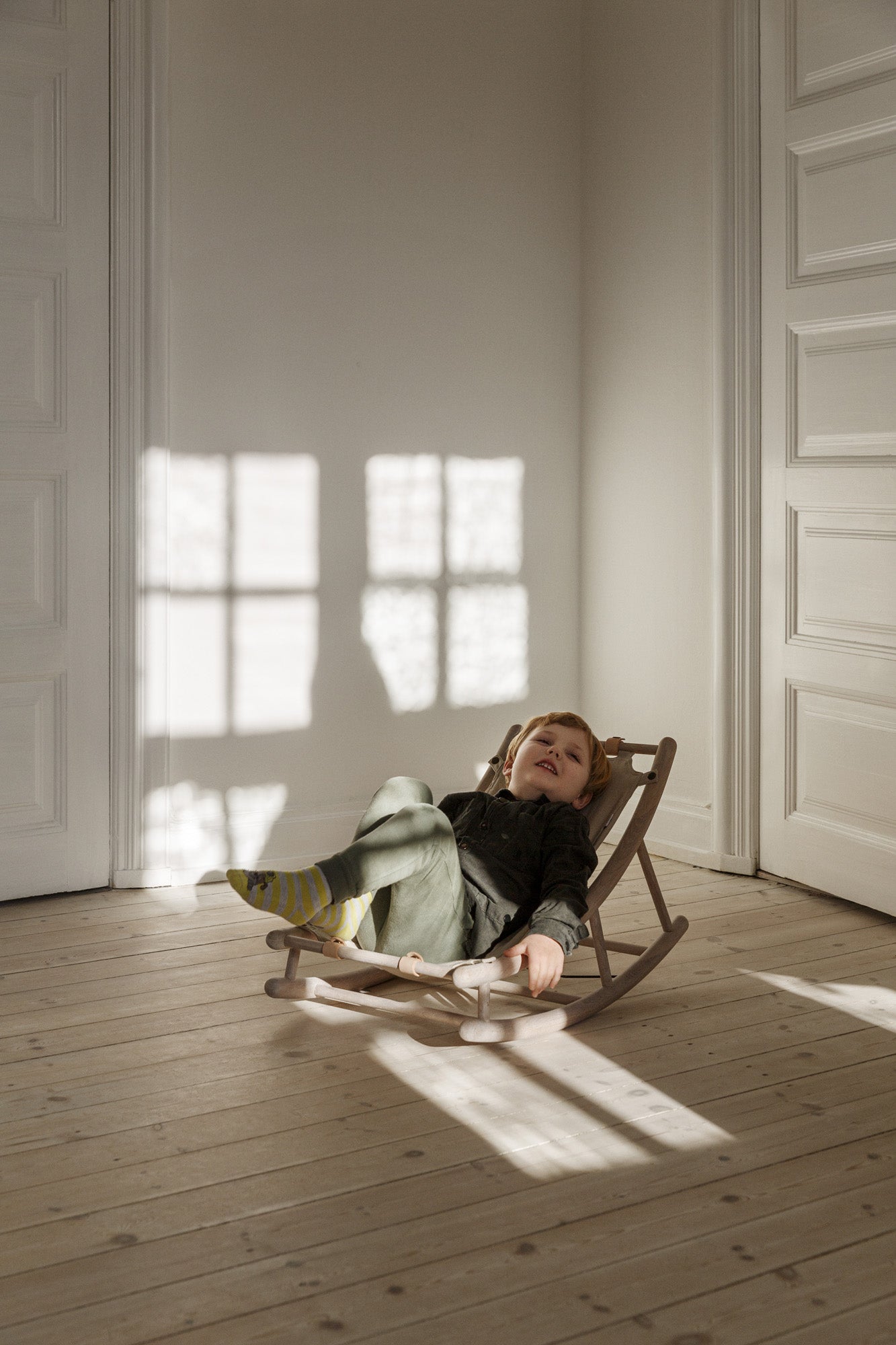 Einer relaxing in the Wood Toddler rocker